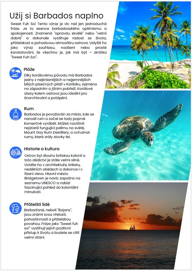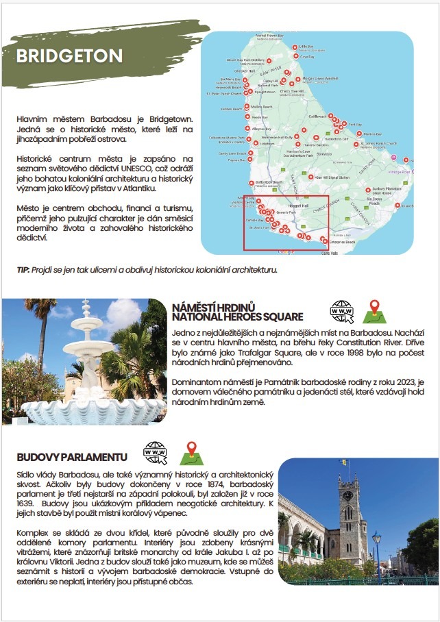 Na celkem 30 stranách najdeš popis více než 40 míst z celého Barbadosu, nejhezčích pláží a to včetně jejich umístnění na mapě. Přidal jsem také odkazy na webové stránky.